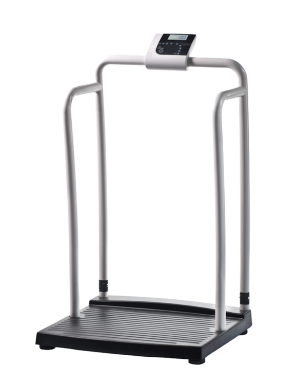 The electronic Handrail Scale is designed for bariatric users. Its unique design and enhanced robust structure assures safety and comfort for large people. Side rails gives support to unsteady patients and movement compensation technology eliminates involuntary movement. Assembly is effortless – a pop-up hinge joint easily sets the back rail upright and the side rails slide in. Two heavy-duty wheels make it easy to easily move the scale.