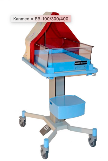Perfect for getting babies quickly out of the incubator. There are 8 versions of the Kanmed Baby Bed available. With the accessories you can order the version that you need. For example, foot pedal for height adjustment, left, right, front (or all 3!), replace storage boxed with shelves, rear mount kit, with or without side rails, Twin Versions etc. Kanmed baby warmer is best mounted under the bed on the standard holder.